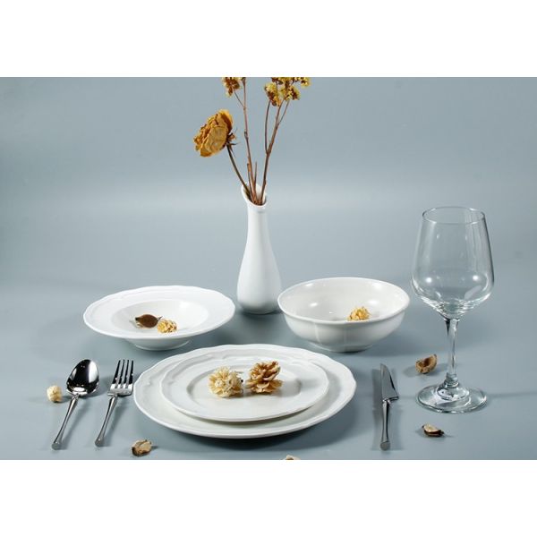 There are embossed patterns on the surface of the tableware, which is very beautiful , distinctive. There are many styles for shapes of square as well as round. It is also various tableware accessories can be provided. Bright white with embossed patterns gives people a very elegant feeling, very suitable for wedding banquets in high-end hotels and restaurants.