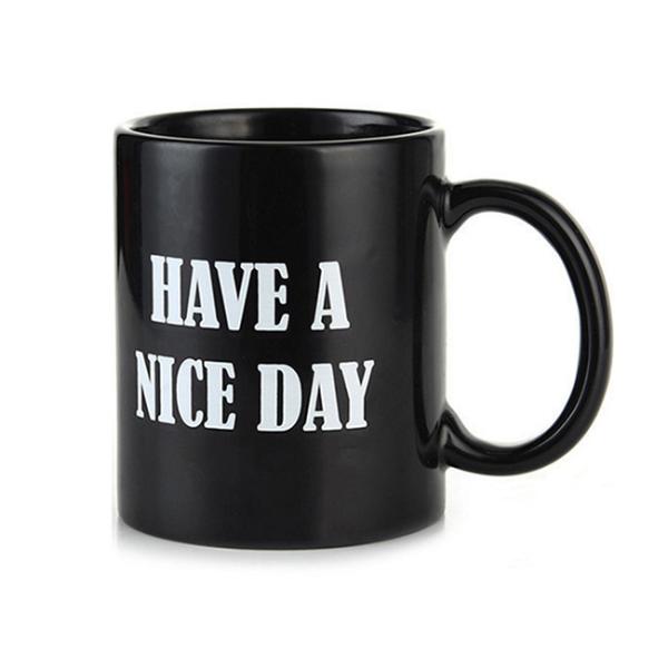 Have a Nice Day ceramic coffee mug makes a great gift at the office party, birthday gift or any gift. Color choice is for color of letters. This ceramic mug cup holds 11ounces of liquid, whether it's coffee, tea, vodka or any other beverage that you enjoy. Available in Black color and have white lettering.